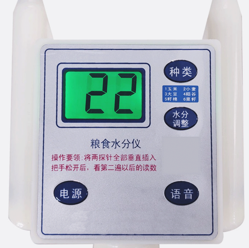 電源:按住該鍵一秒鐘開機或者關機。種類:按住該鍵不松手,將循環改變測量品種。水分調整:按住該鍵不松手,可將顯示的結果上調或者下調語音:按住該鍵不松手,可循環改變語音播報方式