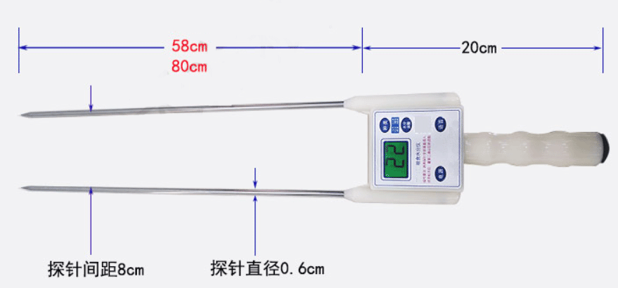 MA-5A/MA-5B插桿式水分測定儀按鍵功能:電源:按住該鍵一秒鐘開機或者關機。種類:按住該鍵不松手,將循環改變測量品種。水分調整:按住該鍵不松手,可將顯示的結果上調或者下調語音:按住該鍵不松手,可循環改變語音播報方式